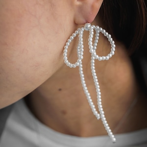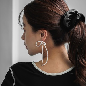 繊細なパールを連ねてリボンの形に仕上げた、上品で女性らしいデザインのピアス・イヤリング。