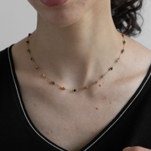 繊細なチェーンのゴールドとカラービーズの鮮やかさを引き立ててくれます。